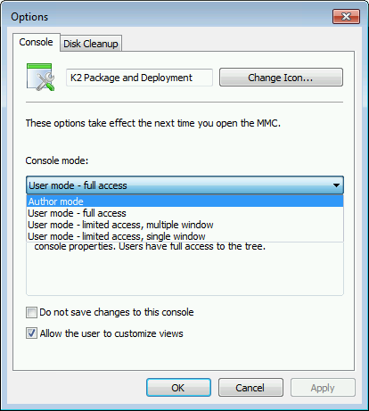 - To set the MMC console from Author mode to User mode, open the Windows Start Menu. Click All Programs > K2 blackpearl. Right-click Package and Deployment. Click Author from the pop-up menu.