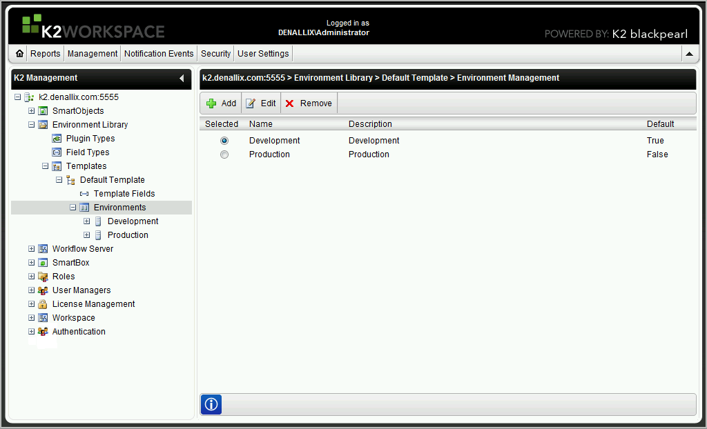 - Refer to the Templates - Environments section of the for more information about creating and editing K2 Environment settings.