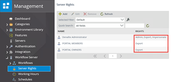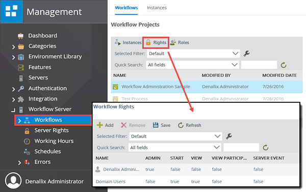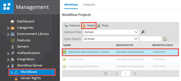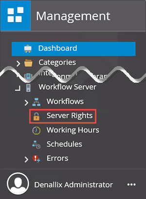 - Navigate to the Server Rights option found in the Workflow Server > Workflows node.