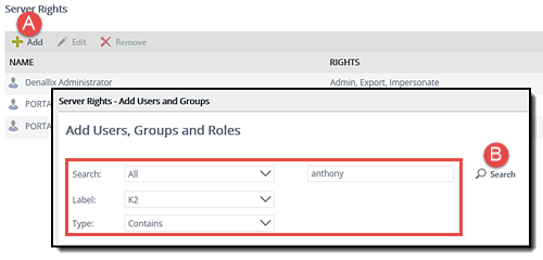 - When the Server Rights screen opens in the central pane, click Add. Confirm the Labelis set to K2, then enter