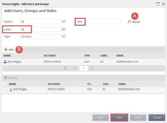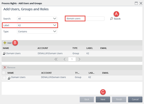 - On the Add User, Groups and Roles screen, confirm the Label is set to K2, then search for
