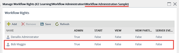At this point, you should see that Administrator is the only user with workflow rights. (If on a K2-provided VM.) Now you are going to add Bob and give him admin rights. This will allow Bob to grant permissions to other users for this single workflow process as he needs to.