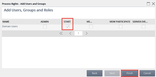 then click Add when you see Domain Users in the results pane. Click Next. - CHECK the box in the Start column, then click Finish.