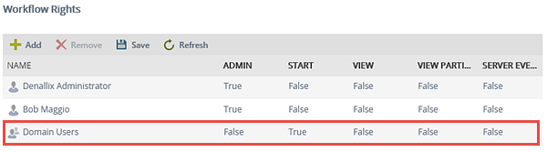 In this final step, you granted permissions, or workflow rights, to the Workflow Administration Sample process. With admin level rights, Bob can now assign permissions for this process as he needs to. All domain users now have the ability to start this workflow. In this step, you observed how you can assign rights to both individuals and groups. To delete the rights for a user or group, simply highlight the name, then click Remove.