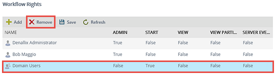 Workflow rights can be assigned to both individual users and groups of users. To delete the workflow rights for a user or group, click to highlight the name, then click Remove. Close the Workflow Rights screen.