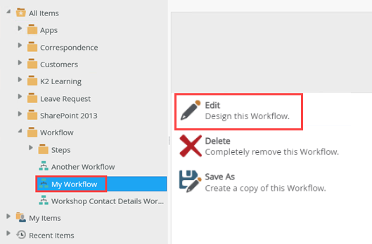 - To access previously created workflows, locate the workflow folder in the Designer category tree. This folder contains all the workflows you created and / or deployed. Select the required workflow and click the Edit link.