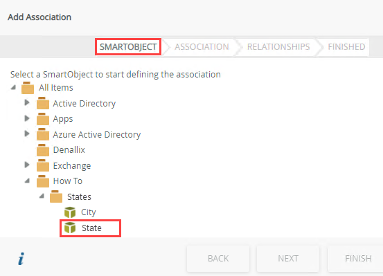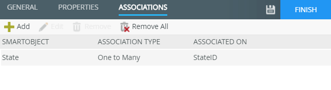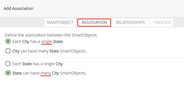 In this step, you associate the City SmartObject with the State SmartObject. Associating SmartObjects creates a link between the two data sources, typically through a common property (such as an ID or other unique value).