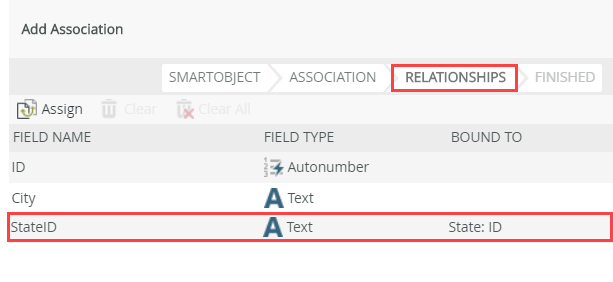 - You should see the StateID property (from the City SmartObject) is now bound to the State (SmartObject): ID property. Click Finish to save the association settings.