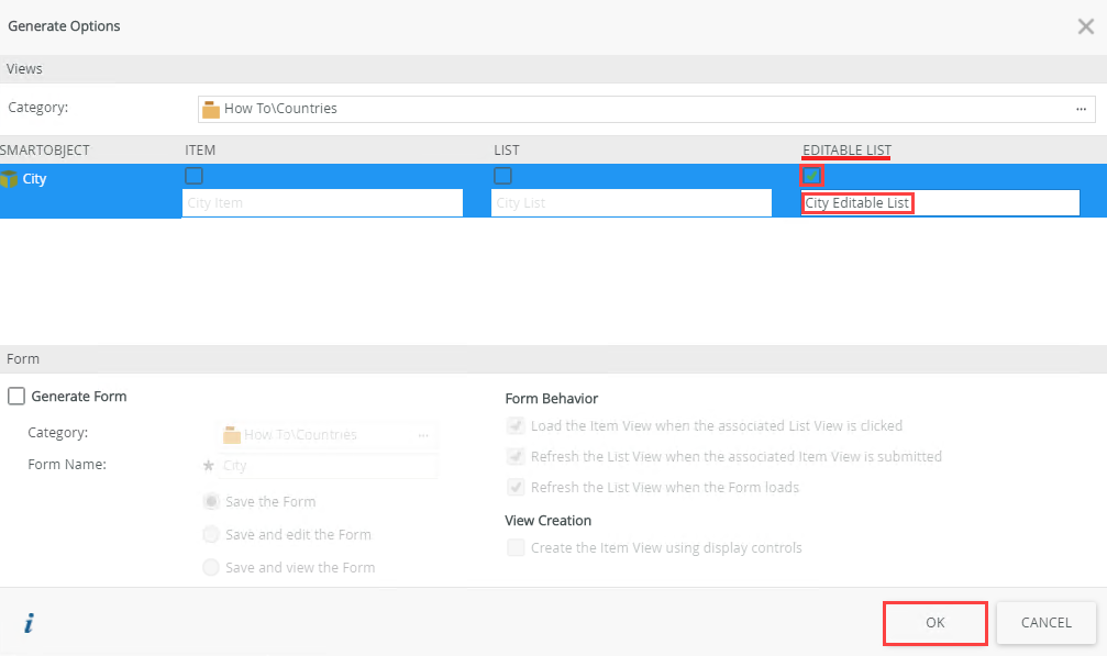 - Check the box below Editable List to create the City Editable List view. The name is populated by default. Click OK.