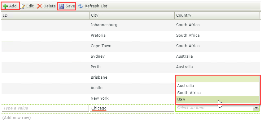- SPLIT HERE Run both views and enter at least two records using the City Editable List view, and at least three records using the Country Editable List view. Run the Country Editable List view first because the City Editable List view is dependent on the data you create in the Country Editable List view. To add sample data to the Country Editable List view, right-click the view and select Run. Click Add and type a value in the Country field. Click Add again to add more items. When you are done, click Save.