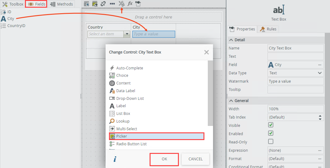 - Drag the City field from the Fields onto the canvas and drop it into a cell. Select the control, click the Change Control icon, select Picker from the list, and then click OK.