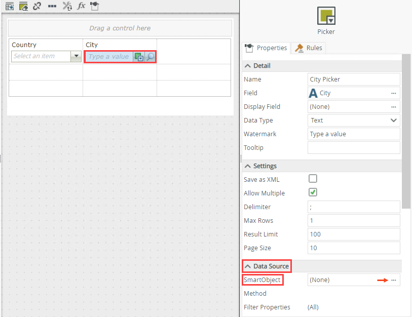 Configure the Picker control. In this step, you generate an Item view for the City SmartObject and configure the Picker control to use the value you select as the country to filter the cities.