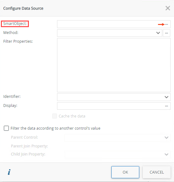 - The Configure Data Source dialog opens. Click the ellipsis next to SmartObject.