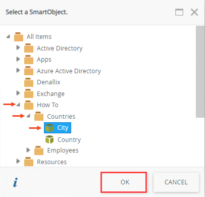 - Expand the folders where you saved the City SmartObject. Select the SmartObject and click OK.
