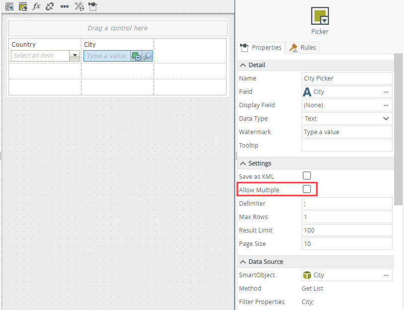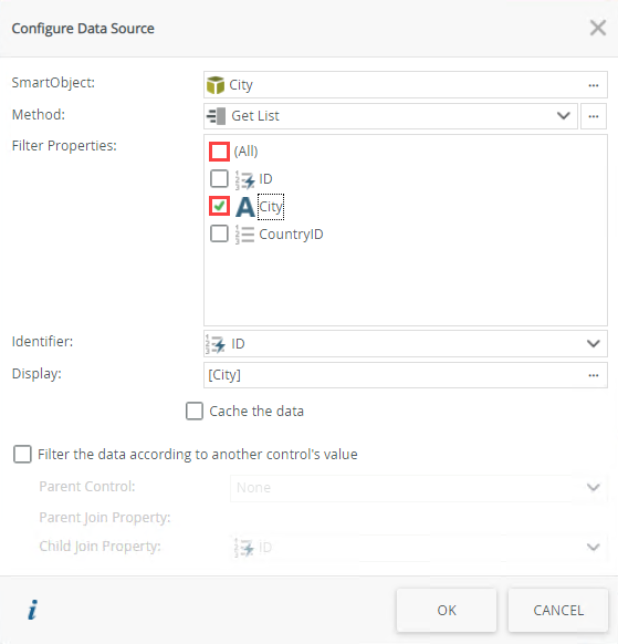 - Specify SmartObject properties on which you want to search when you type a value in the picker at runtime. Uncheck All next to Filter Properties and then mark the check box next to City.