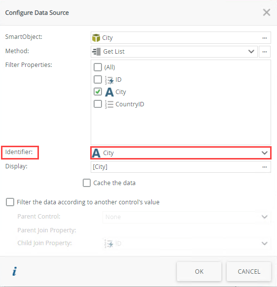 - Specify the SmartObject property to use when you save values in the picker. You want to use this property to display when you list the countries and cities. Select City from the drop down list next to Identifier.