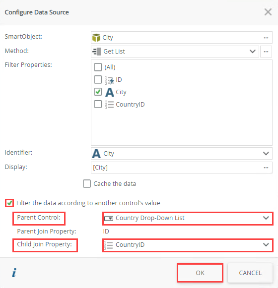 - Next you want to select and configure the control (parent control) to use to filter the City picker's results. Check the box next to Filter the data according to another control's value. Select Country Drop-Down List next to Parent Control and select CountryID as the Child Join Property. The value of the Country Drop-Down List control is used to filter the results for the City control. The Child Join Property is the SmartObject property on the current (City) control that is used to filter the data. This property links the parent data to the child data and needs to match the parent join property. Click OK to save the configuration.