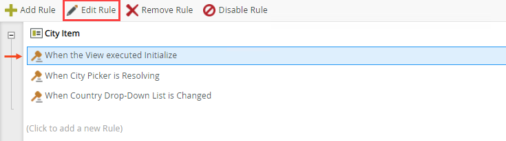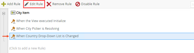 - To enable the Picker control after a value is selected in the Country control, on the Rules page select the When Country Drop-Down List is Changed rule and click Edit Rule.