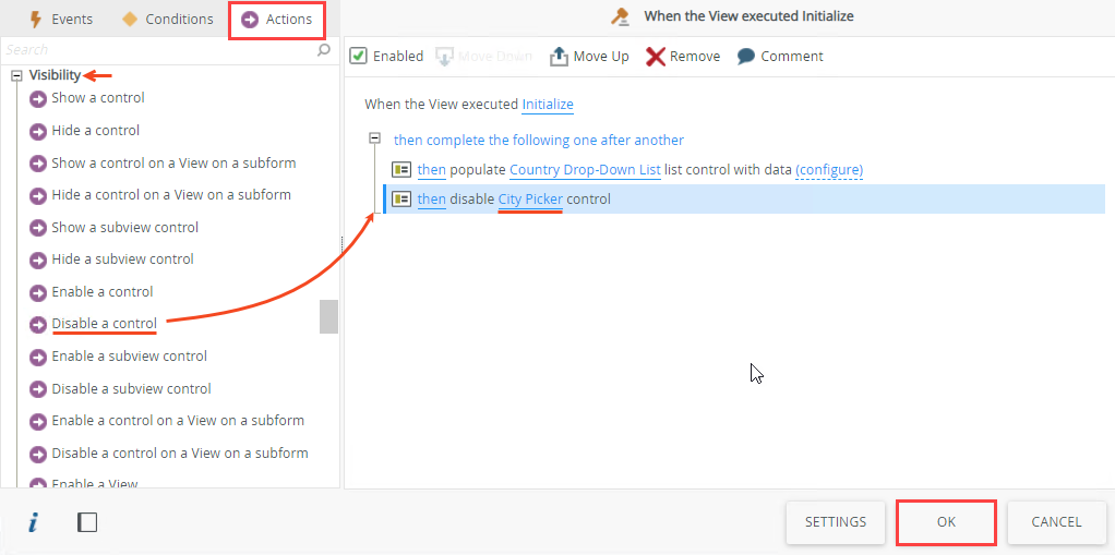 - Select the Actions tab, click Disable a control in the Visibility section, and then select City Picker. Click OK to save the rule.