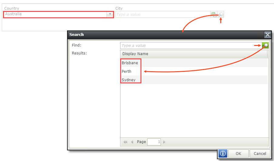 - Select a value from the Country drop-down list, click the search icon in the City control, and then click the search icon on the Search dialog. Note the results are filtered according to the country you select.