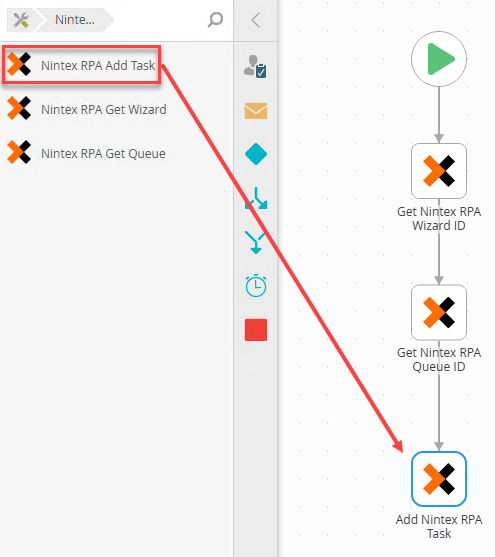 - From the Toolbox click the Nintex RPA category, and then drag the Add Nintex RPA Task step onto the canvas.