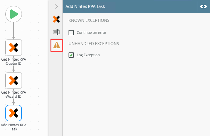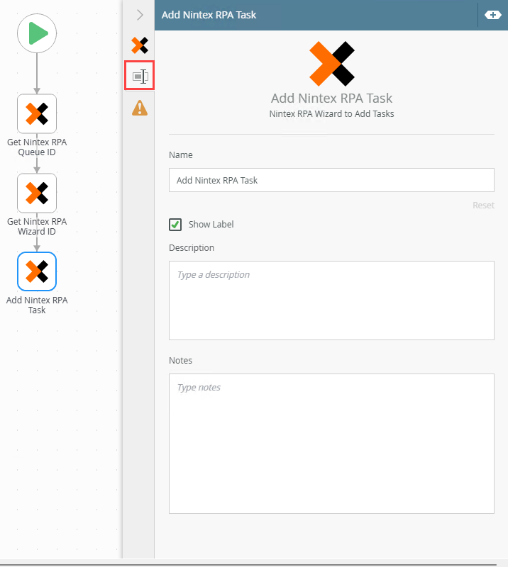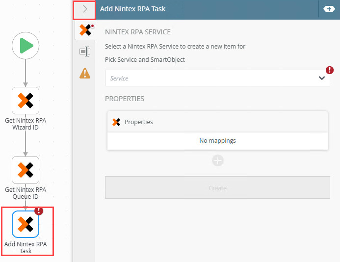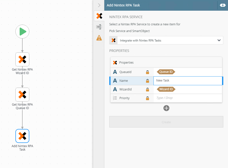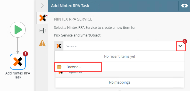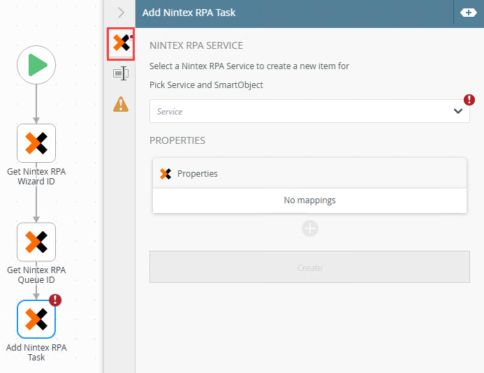 - Select the Nintex RPAService tab. Use this tab to configure the task properties.