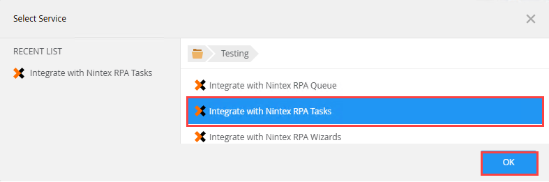 Use this to select the Nintex RPA SmartObject that is linked to your RPA server. This allows the step to link to the Wizard and Queue from the RPA server. |