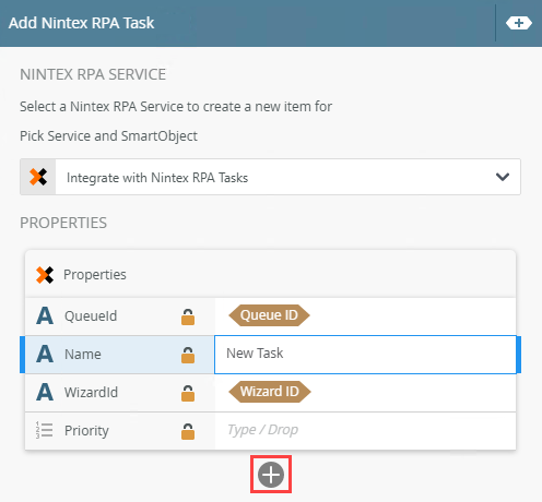 Use this to add properties such as the Wizard ID and Queue ID to ensure the correct bot task in run in RPA. Type values or create dynamic values by dragging Functions, Fields, SmartObjects and Workflow-related items from the Context Browser into the fields. |
