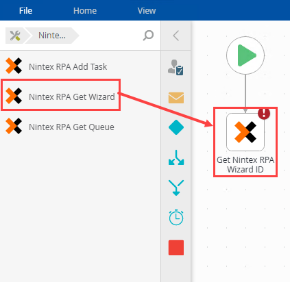 - From the Toolbox click the Nintex RPA category, and then drag the Get Nintex RPA Wizard ID step onto the canvas.