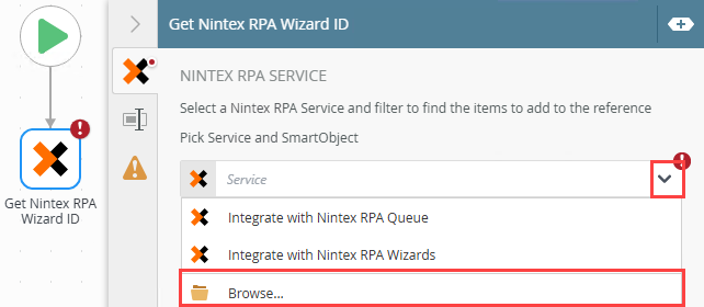 Use this to select the Nintex RPA SmartObject, that is linked to your RPA server. This allows the step to link to the Wizard from the RPA server. |