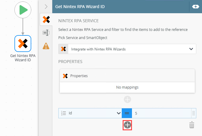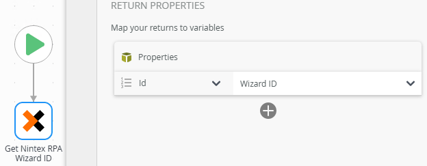 The Output mappings for the Get Nintex RPA Wizard ID step are listed in this section. These mappings are used to store any return values from the Get Nintex RPA Wizard ID step. The return property can be mapped to a Variable, XML field or another SmartObject property. |