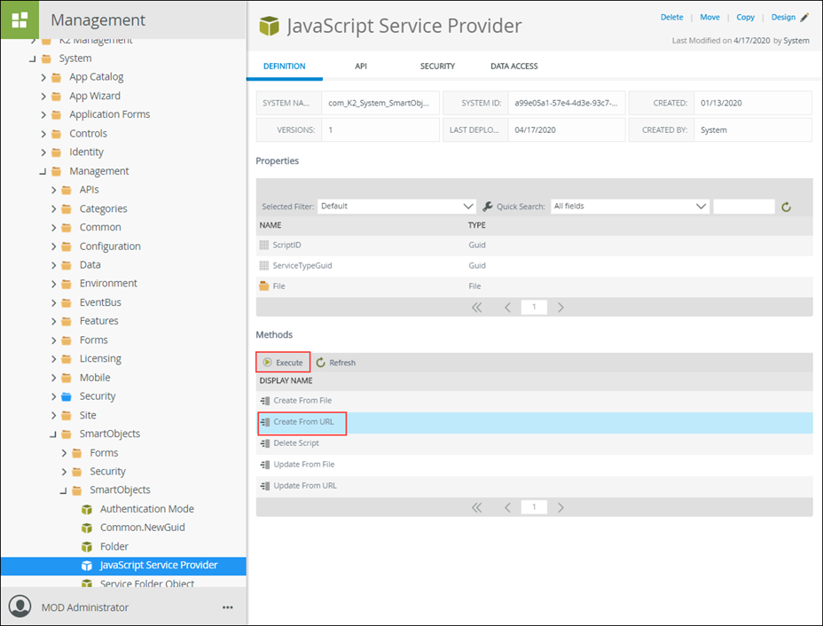 - Select the JavaScript Service Provider SmartObject and execute the Create from URL method.