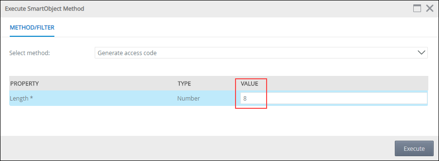 - Enter a number for the length of the string and click Execute. The Generate access code Method and the property named Length show in the image is the Method name and pCharacters parameter shown in the code in Step 3a, point iii above.