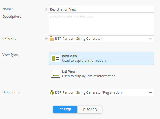 - Enter Registration View for the name of the view and make sure the correct category is selected. Then select Item View as the View Type and the Registration SmartObject as the Data Source. Click Create to continue.