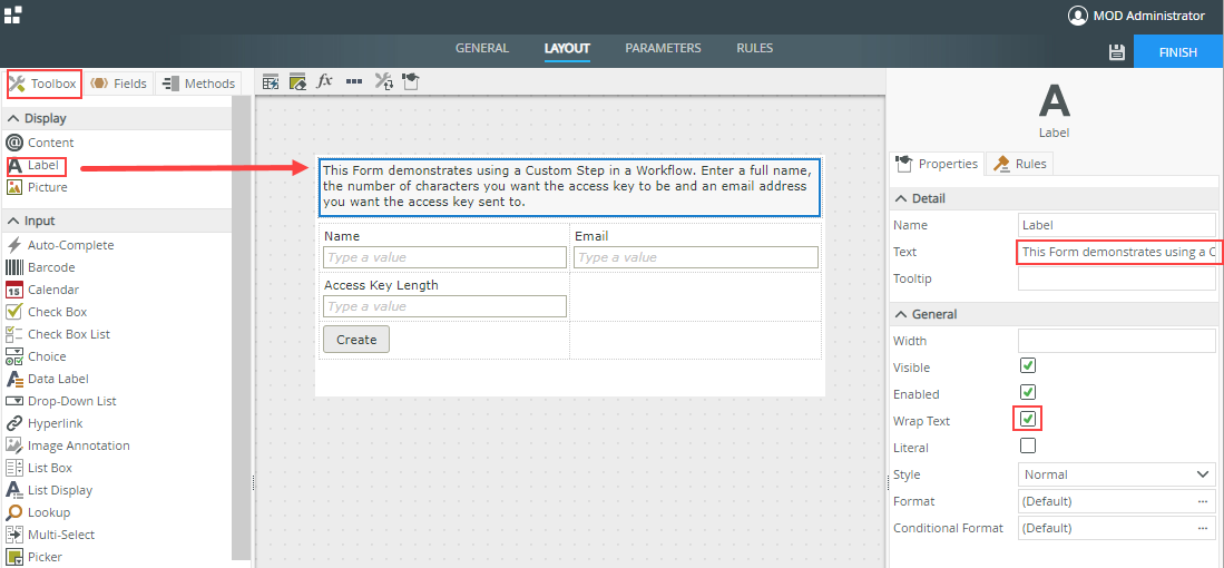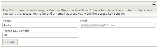 This Form demonstrates using a Custom Step in a Workflow. Enter a full name, the number of characters you want the access key to be and an email address you want the access key sent to.