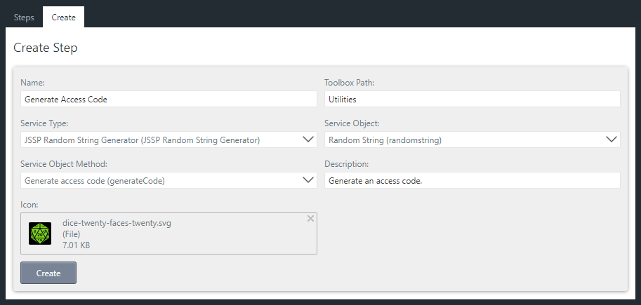 Enter a Description like Generate an access code. and add a SVG image to use as the Icon. Click Create to continue.