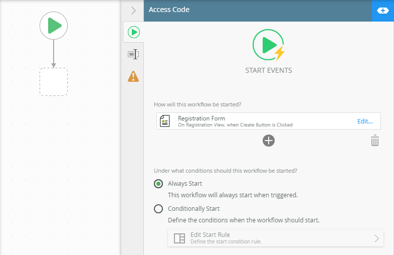 - Configure the start step. Set the workflow to be started when the Create button is clicked on the Registration Form. Do this by clicking the Edit... link, and then click Next and OK on the wizard to finish.