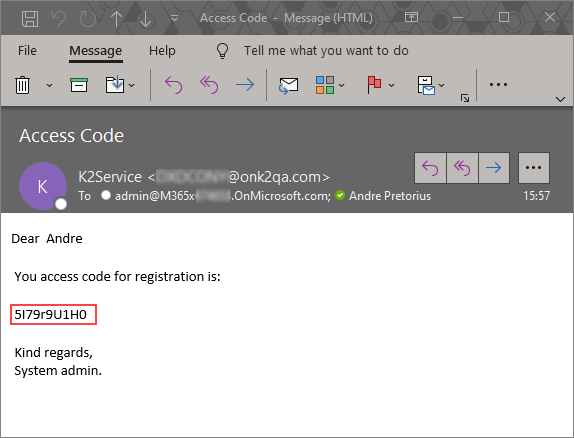 Test you work by running the Registration Form, filling in the details and click Create. If you use your own email address in the form, you should receive an email with the randomly generated code. The originator that started the workflow should also receive the email with the access code.