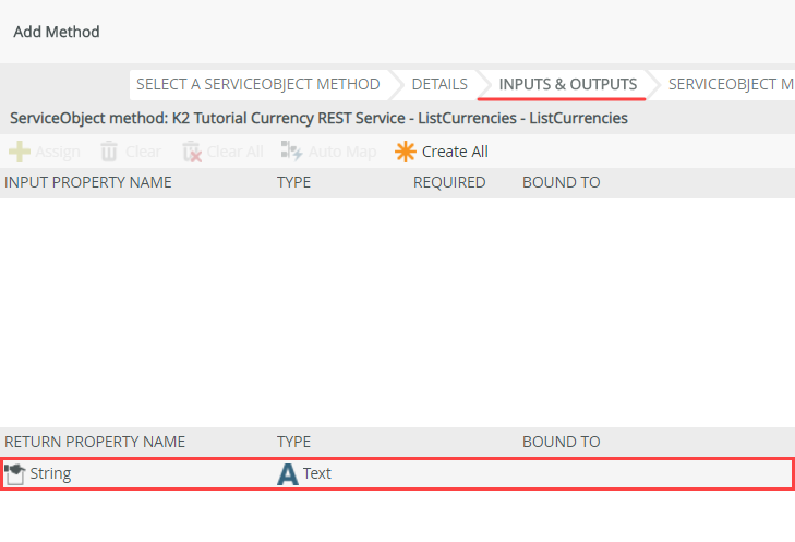 - You are now on the INPUTS & OUTPUTS screen. Double-click the String RETURN PROPERTY NAME. You create a property in your SmartObject that is mapped to this string return property.