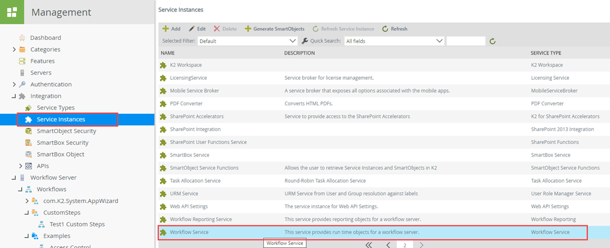 - Use the Service Type column to find an instance of the service type you will create a SmartObject for. In this case, we will use the Workflow Service Service Instance of the Workflow Service Service Type:
