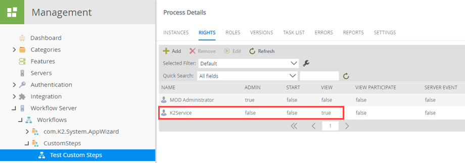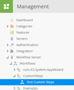 - Remember that workflow steps execute in the context of the K2 Service Account. To add comments to the workflow instance, the K2 Service Account requires View permission on the workflow. Launch K2 Management and navigate to the workflow you just deployed. In this example, the workflow is located at Workflow Server > Workflows > CustomSteps > Test Custom Steps