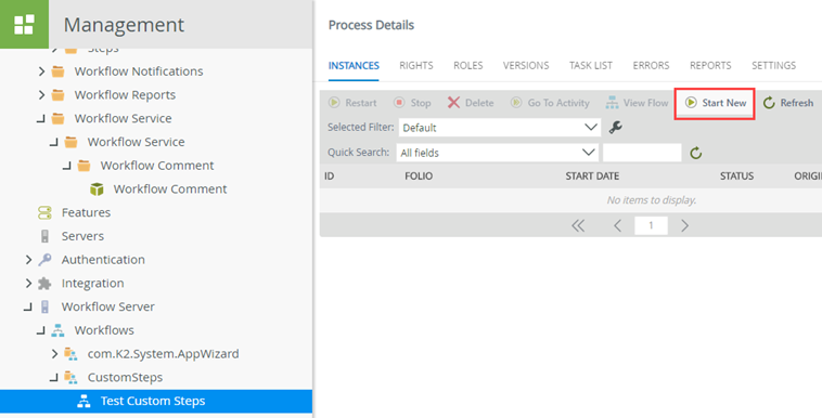 - In K2 Management site, use the Start New button in the INSTANCES Tab to start a new instance of the workflow. Use any value for the Folio and click Start. Make a note of the ID of the workflow.