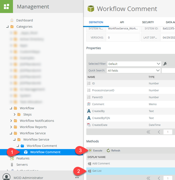 - Navigate to the Workflow Comments SmartObject, located in Workflow Service > Workflow Service > Workflow Comment and Execute the Get List method. Enter the value of the Process Instance ID that you made a note of the previous step.
