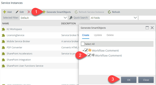 - Create or identify the Service Type, Service Instance, Service Object Method that you want to use for your Custom Step. If necessary, create a SmartObject for the Service Object. In this example we will use the existing Service Object for Workflow Comments, and generate a new SmartObject for it.