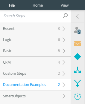 - When the workflow designer loads, locate your new custom step in the toolbox. In this example, you can find the custom step in the Documentation Examples group.