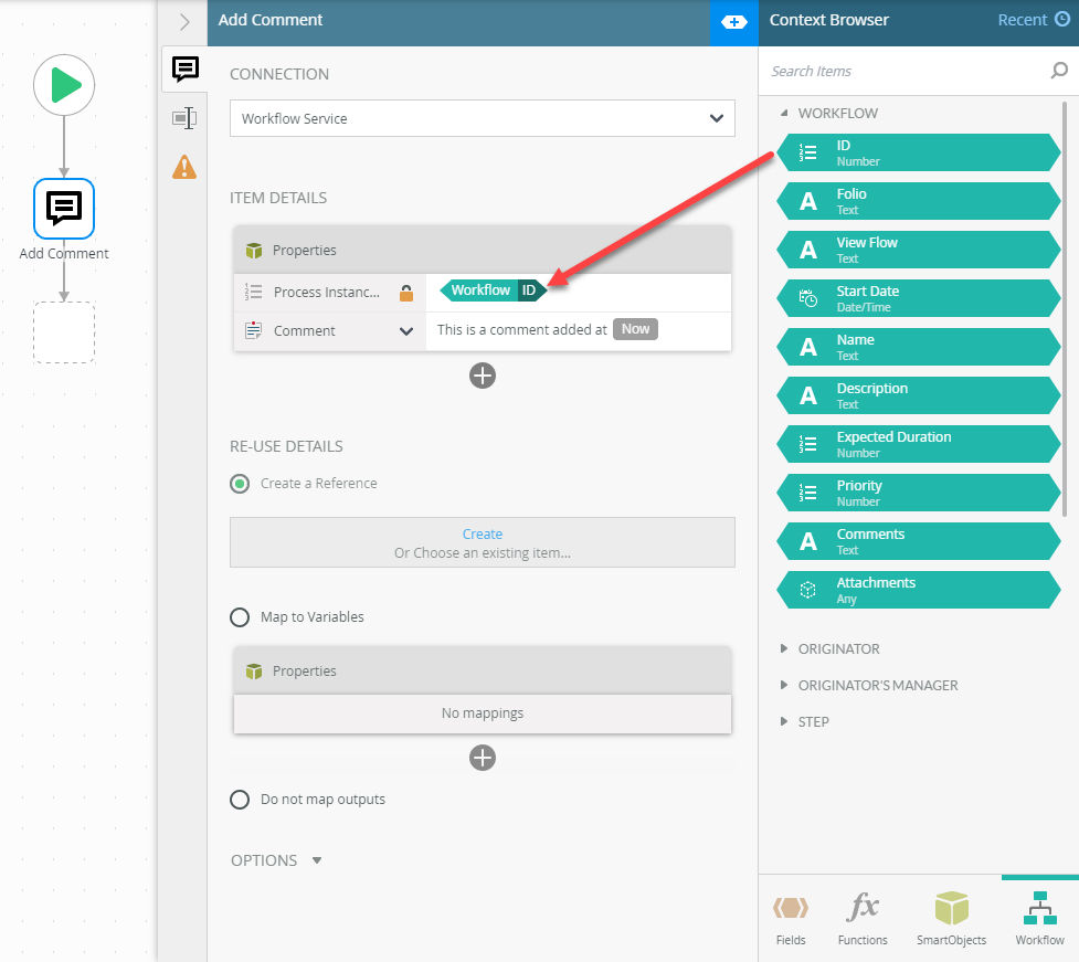 - Expand the configuration panel for the step. Drag and drop the Workflow ID property from the context browser into the Process Instance ID field, and type some value for the Comment field. (In this case we also included the Now function from the Functions tab, but you can enter any value you like)