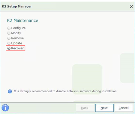 After you have fixed the cause of the error, rerun the Setup Manager to continue from where it stopped. It launches into the K2 Maintenance page with the Recover option selected, and all other options grayed out. Click Next to continue and finish the installation as usual.