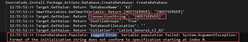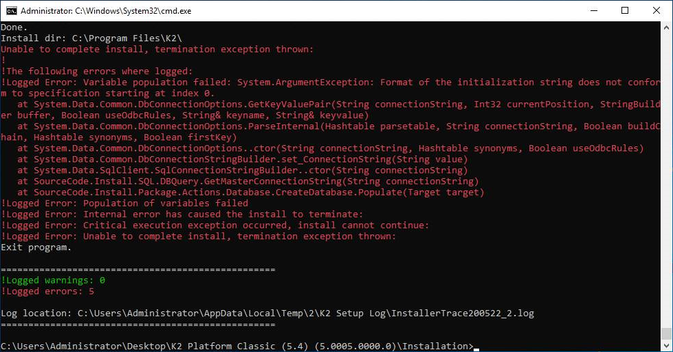 Open the InstallerTrace log file and identify what caused the blocking error. In the example above, there is no connection string to the database, which caused the blocking error and stopped the installation. The InstallerTrace log reflects this: