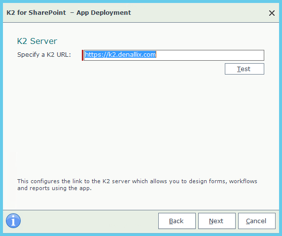 Specify a K2 URL on the K2 Server panel. This configures the link to the K2 server which allows you to design forms, workflows and reports using the app. The IIS manager can be used to find a K2 URL and check the bindings. An example of a K2 server URL is: HTTPS://k2.denallix.com.