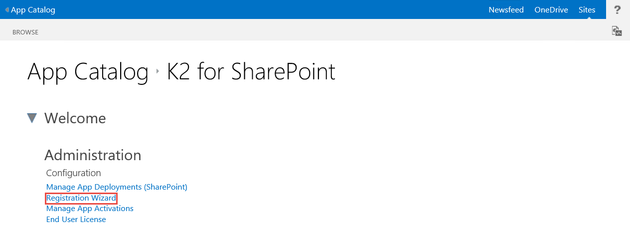 - On the App Catalog > K2 for SharePoint page, click the Registration Wizard link in the Administration section.